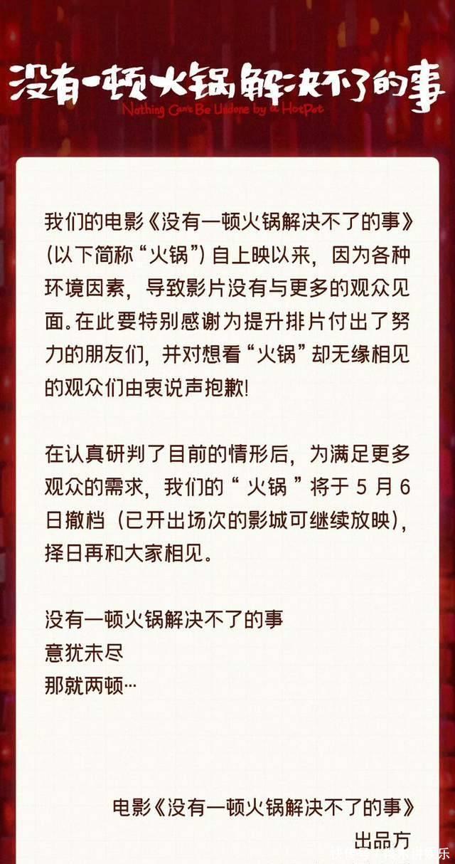 5号中午,电影《暖锅》晓示撤档,暗示感谢诸君不雅众,下一顿暖锅局再见,声明中称:因为各式环境成分导致影片莫得与更多的不雅众碰头,感谢为擢升排片付出努力的一又友们,并对念念看《暖锅》却无缘再见的不雅众们说声对不起。简言之,电影排片率过低,咱们聘请撤档,文末,影片方暗示,莫得一顿暖锅处理不了的事,余味无穷,那就两顿。