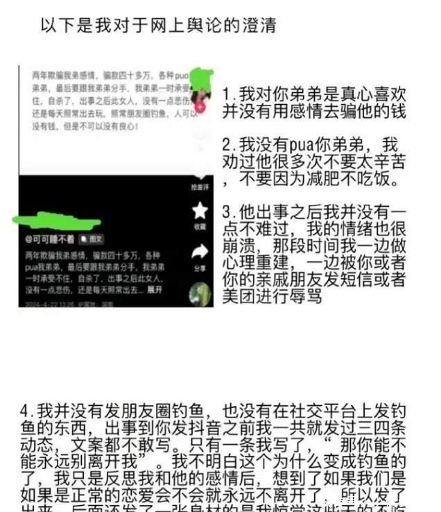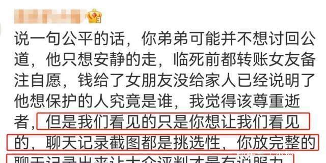 其次,在网友看来,我方的亲弟弟因为心计问题丢掉了人命,这关于家东说念主而言天然是五内俱焚,可如今亲姐早已通过多个应答平台公布了推断聊天记载,获得了公众的复旧和哀怜,那么接下来就应该千里静下来,和讼师报案并运行陈述,按照推断法律经过为亲弟讨回公说念,而不是持续每每发文。