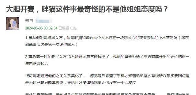 按照网传女方所言,和“胖猫”父母在开端也曾迎来妥协,女方私行送还给了胖猫父母13万,如今胖猫亲姐每每活跃在网络上,条件凭据和公说念,在部分网友看来,似乎思要绕过官方次序,试图通过公论的力量让女方还钱,以致名誉受到影响。