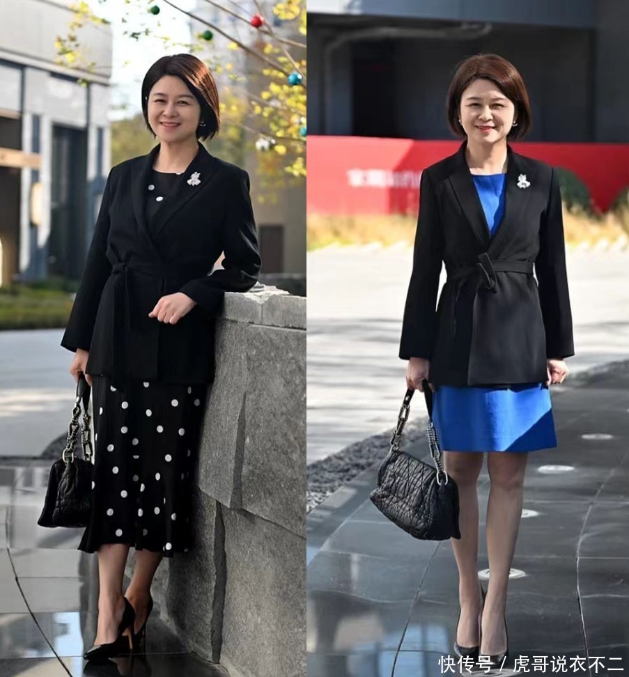 比喻说大龄女士很心爱衣着的西服,一般会把持在相比厚爱的方位,浅易的颜色天然更能演绎出高等大方的好意思感。像图中这种玄色西服,广宽的线条剪辑,不错勾画出更具有挺阔感的肩型,而配合腰带的话,又能幸免腰部线条被拉宽。