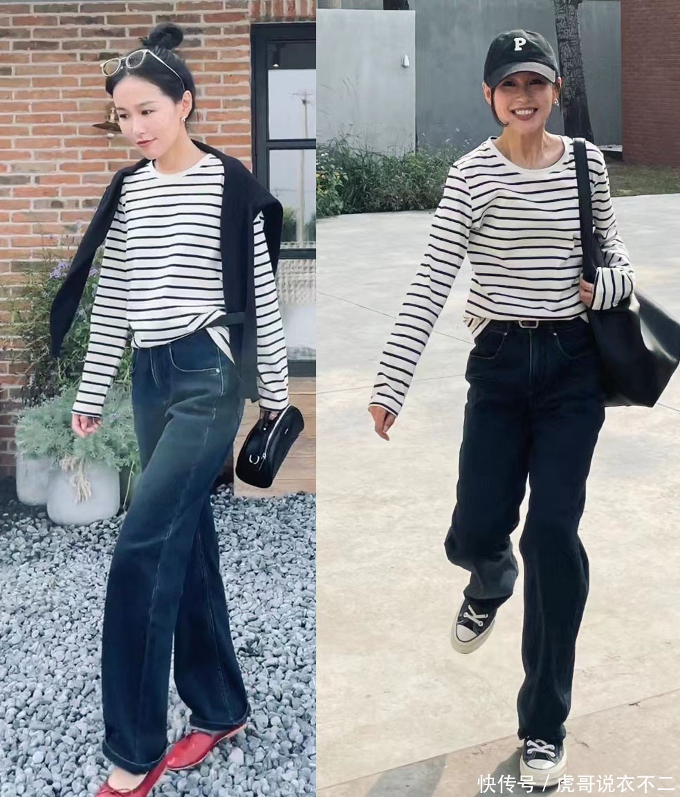 比喻说东谈主气很高的条纹元素,就以诅咒配色占据较大比例,不错松驰地解脱泛泛纯色系穿搭的单调感,赋予造型更多的存在感。而对于条纹的具体遴荐,不错多多激情条纹宽度。