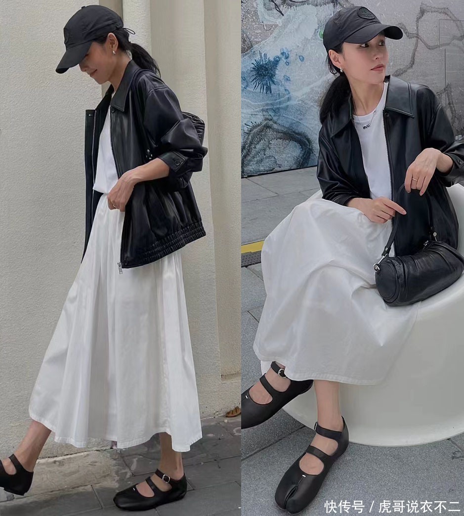 岂论是玄色或是白色,齐能使服装领有更多的百搭感,而上图这件玄色皮衣,展现出的酷帅感也特殊惹眼,而下搭白色半身裙,会平缓过多的强势气味,均衡出相比雅痞的视觉风姿。