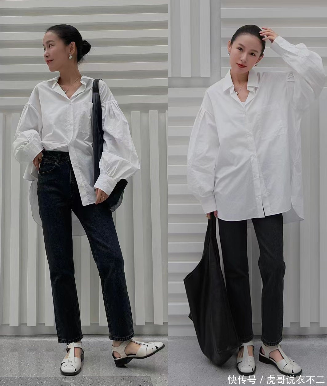 白衬衫的百搭感是抑遏置疑的,不错通过与不同颜色下装的搭配,展现出更为多元化的造型气派。但也有些女性会注重到衬衫版型的宽大感,后续不错参考上图的两种不同穿法,齐能在视觉上合作高下身的量感,幸免变成迟滞拙劣的嗅觉。
