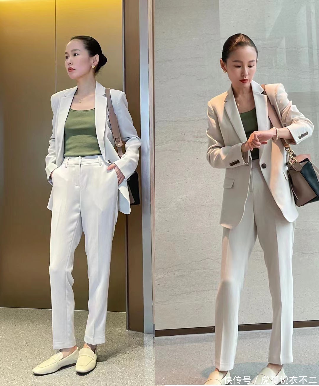 举例图中这位女士的造型中,采用的是米白色的西服套装,最初决定了造型气派的基调,再配以浅绿色紧身背心,就能完好意思凸起优雅轻微的魔力。